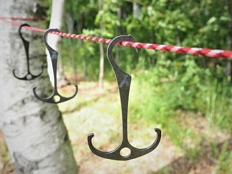 イカリ内側のカーブ角度により、吊り下げたギアの付属ロープやヒモなどが中央に寄って滑り落ちて荷重するため、片方だけにギアを吊り下げても傾きにくい構造です。